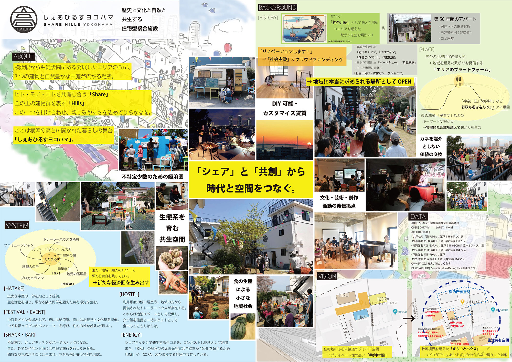 60年前に建築されたRC造の住宅のオーナーが、自らこの地を持続させるために、シェアスペース、飲食スペース、イベントやキッチンカーも使える中庭を整備して運営までを行うプロジェクトです。魅力的な歴史的背景と共に、建築のポテンシャルを人々の繋がりの核にしている点が評価できます。街の中に楽しげな一角ができ、拡散されていく期待感も持てる一方、一過性のイベントやボランティアに頼り過ぎ、経済的な持続性、循環のイメージが見えづらかった点には改善の余地があります。