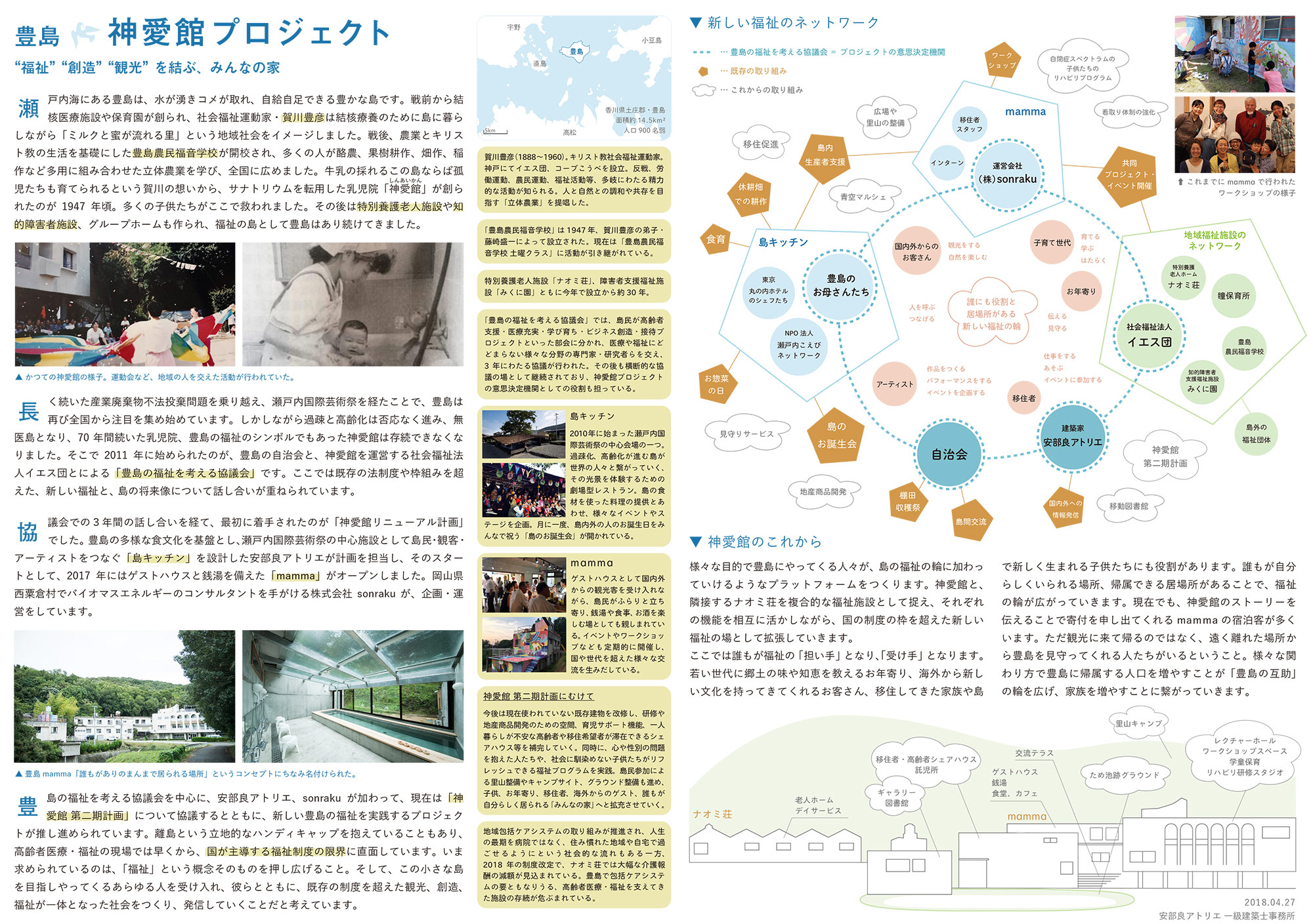 瀬戸内に浮かぶ「豊島」の旧乳児院「親愛館」の建物の再生を期に、島内で新しい福祉のネットワークをつくる試みです。先行する「島キッチン」での豊島のお母さんたちの活動、「神愛館」のリノベーションの過程、2017年に生まれ変わった「mamma」銭湯付ゲストハウスの運営は、島内外の人が互いに助け合いながら互いの居場所をつくりだそうとしていることが特徴です。これらの連携した活動に今後に計画されている「神愛館第二期計画」が加わることにより、豊島に「Local Republic」な新しい福祉の姿が現れることが期待されます。