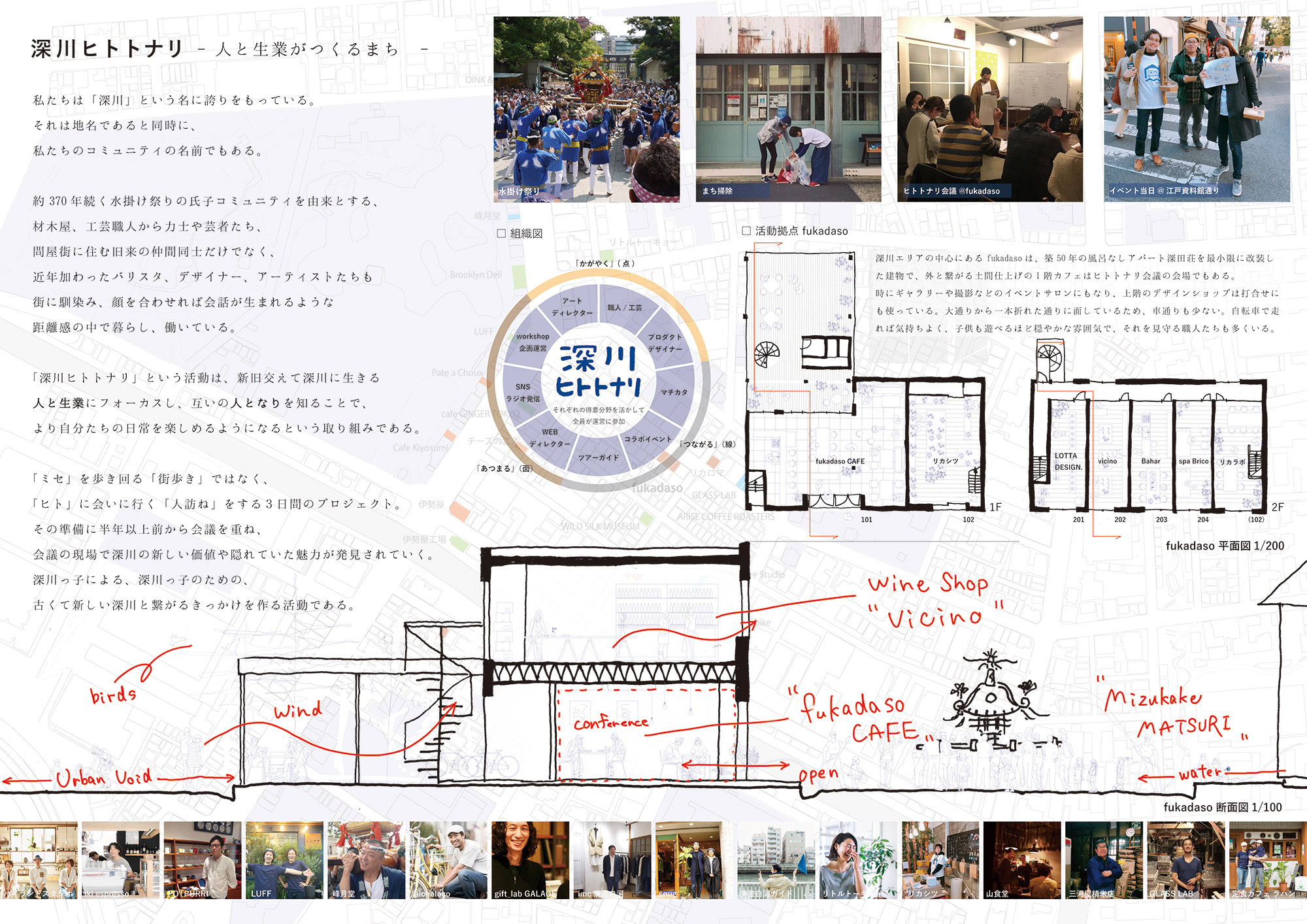 清澄白河地域の、「人と生業」をきっかけとしたまちづくりです。歴史のある「水掛け祭り」コミュニティに由来する職人や材木屋といった地元民と、デザイナーやバリスタといった新住民が加わり、町にリノベーションによる小規模拠点を展開しながら活動を広げています。まだ始まって間もない活動であり、今後の展開にも期待したいと思います。