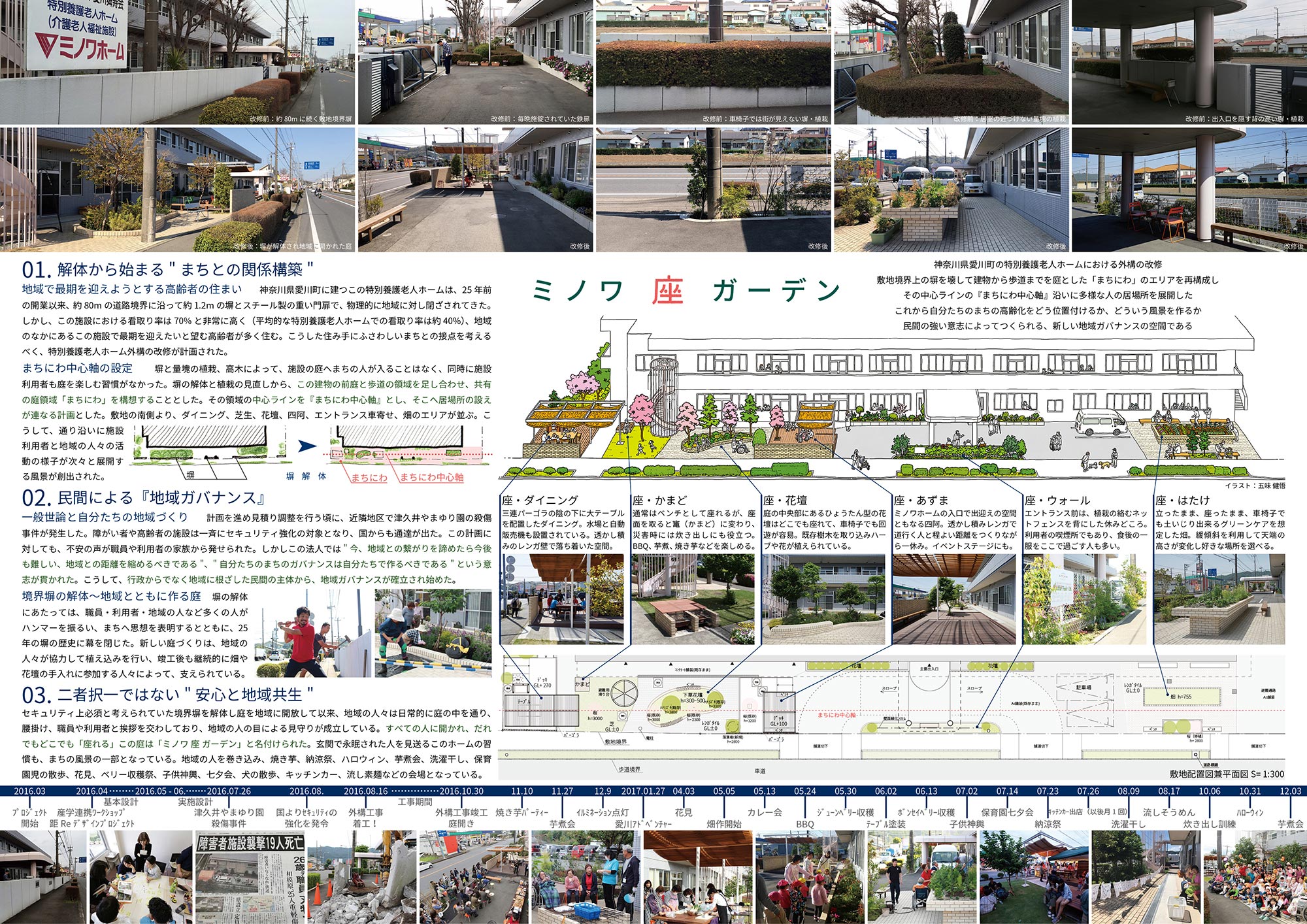 特別養護老人ホームの塀を解体し、地域に開放された庭をつくった事例です。入居者だけでなく、地域の人々にとっても利用できるさまざまな居場所は、高齢化とどのように向き合っていくかという問いを地域社会へ発信しています。今後も更に、地域を巻き込んで利用されていくと思いますが、その可能性が評価されました。