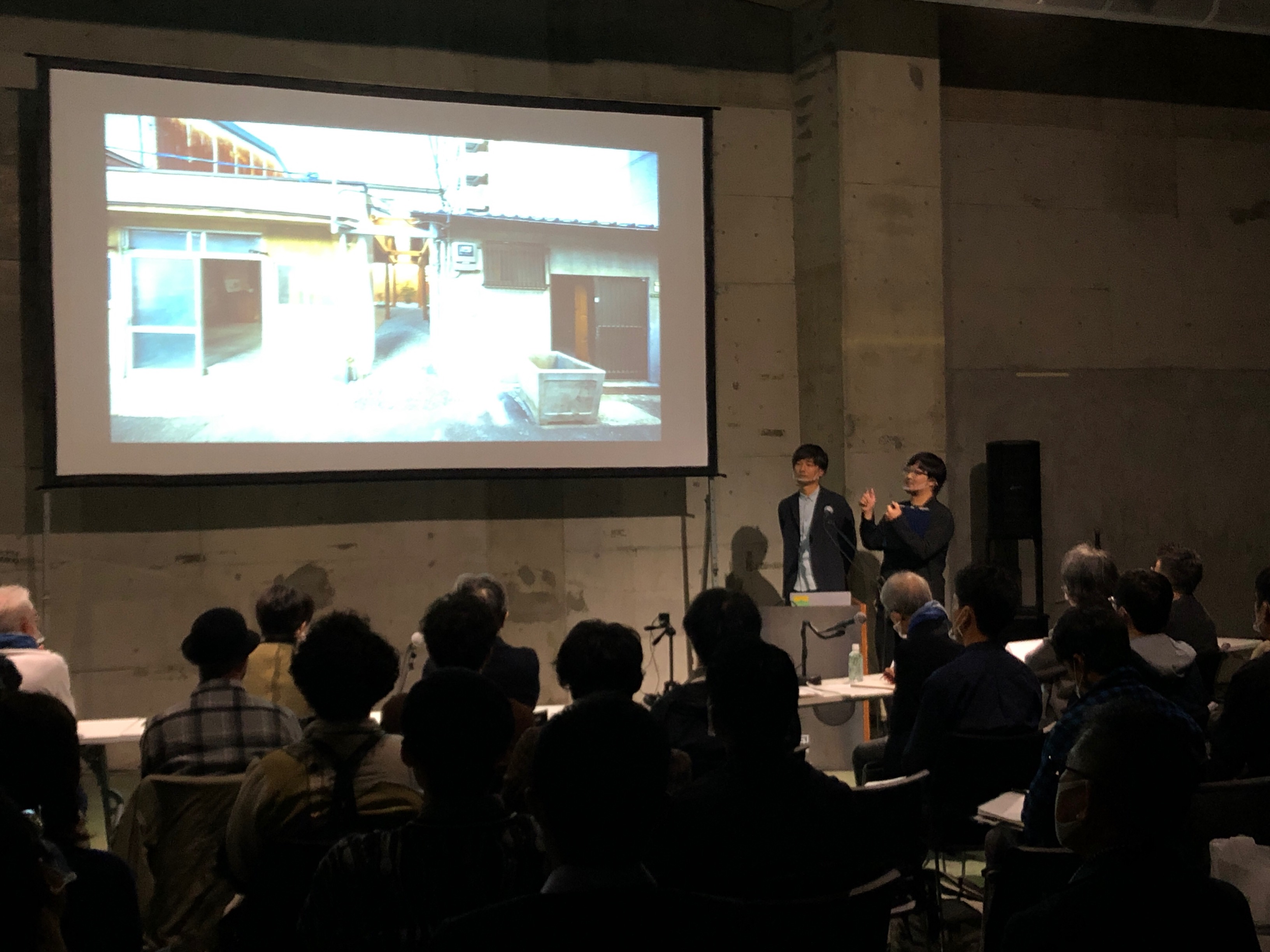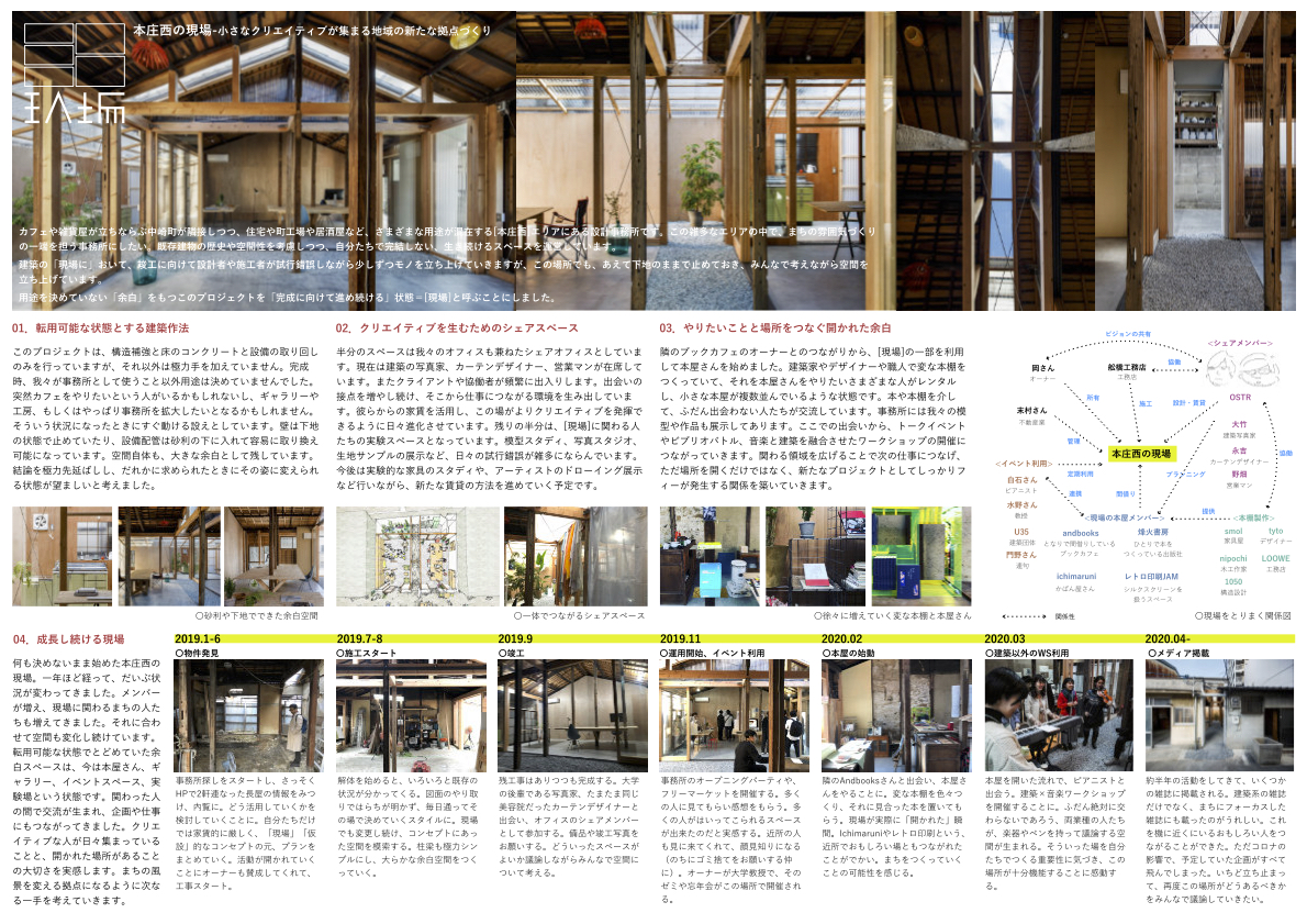 2棟並んだ長屋を合築し、半分をシェアオフィス、半分を作業やイベントの実験場として使い始めたプロジェクト。既存のフレームの内側に沿わせた耐震補強の軸組、隣地とのあいだに架けられた透明樹脂の波板による下屋、構造補強された床スラブと人と設備配管のとおりみちである砂利敷きの対比、がそれぞれ美しく、その様子が路地から元々は便所のくみ取り用に設けられた通路をとおしてうかがえる。同じ設計者・所有者によるビルのリノベーションの計画が進んでいて、今後はまちとしてのひろがりが期待される。