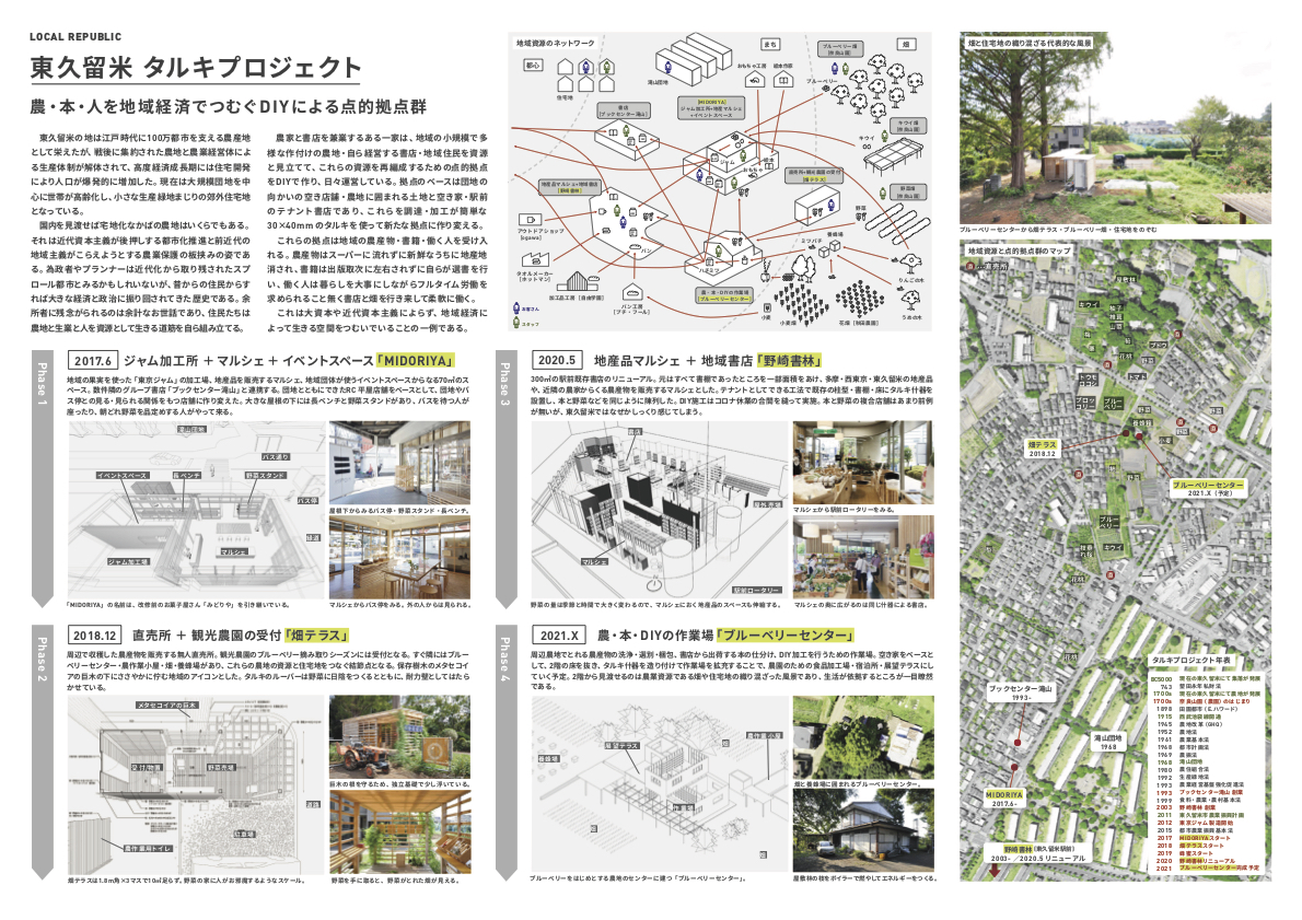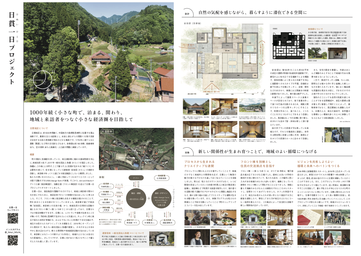 1000年続く山間の村で、来訪者と地域の人によって生み出される小さな経済圏の提案。点在する空き家をフロントと宿へと改修し、集落を巡りつつ、暮らすように滞在できる。山や空、日常風景を切り取る美しいプレゼンテーションから、当たり前のように感じられるまちの風景の中に素晴らしさがあるのだということを、目に見えるかたちにしていくことこそが、これからのまちづくりに必要なのだと感じさせられた。高齢化や過疎化が進む中、外から訪れる建築家やクリエイターと地域の人々が力と知恵を出し合い、協力して共にまちの未来を考える一つの事例として評価された。今後さらにプロジェクトが増え、活動がつながり広がっていくことが期待される。