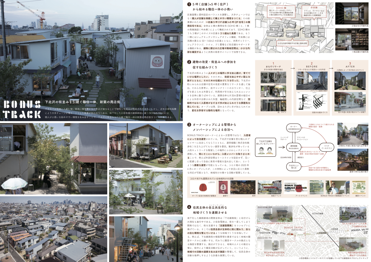 「人間のための都市計画」で知られるクルチバの元市長が訪ねて絶賛したことのある下北沢。国際的にも評価の高いこの街が、道路貫通、小田急の地下化などの開発とともに、狭い街路、路地が入り組むなかに独特の賑わいを生んでいた本来の魅力を失うのではという心配があった。だが、「BONUS TRACK」は、鉄道の地下化に伴って地上に生まれた空地に、その懸念を吹き飛ばすような、下北沢の近未来を切り開く素敵な場所を生み出した。