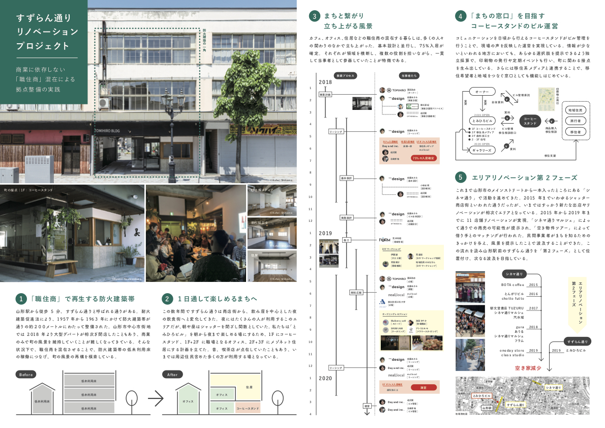 すずらん通りリノベーション・プロジェクト」はとても地味な提案に見えた。応募のフォーマットがA3横一枚というものなのだが、プレゼンテーションを大きく失敗している。応募資料からは、山形駅近くにある防火建築帯の一角をリノベーションした小さなコーヒースタンドの提案でしかないように見える。そのため一次審査ではボーダーだったのだが、審査資料に描いてあるダイアグラムや小さな写真を見ていると、5年前から始まっている小さな商業プロジェクトがネットワークされ、次第に地域を再生する運動になっているように読み取れた。そして、提案の中心としている地味なコーヒースタンドが、この地域再生ネットワークのハブとなっており、同時に地域社会とのインターフェースになっていることが主張されているようにも読めた。そこで、遠方ではあるが、是非公開審査の会場に来てもらおうということになった。そして、来てもらって大成功だった。時系列を追って説明されるプロジェクトは大変な迫力を持っていた。それは商業活動をプロジェクトの核としながら「商業に依存しない職住商混在による拠点整備の実践」となっていた。素晴らしい提案であった。祝福したい。