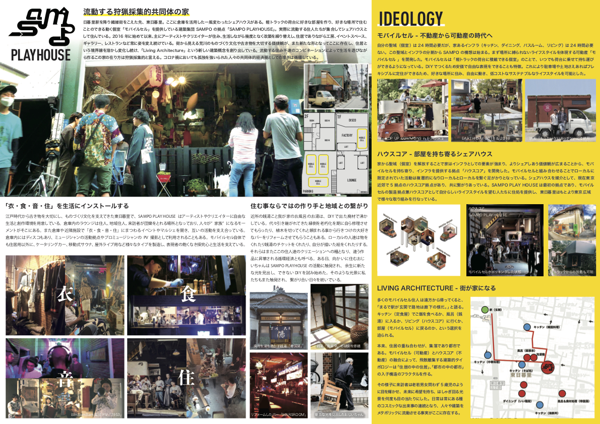 「建築集団SAMPO」の拠点が「SAMPO PLAYHOUSE」である。彼らが住むためのシェアハウスであると同時に、地域住人、来訪者が団欒をとる場所であり、さらに東日暮里地域の空き倉庫や近隣施設で「衣・食・音・住」に関わるイベントやマルシェを開く時のバックアップとして使われているという。時にはディスコとしても使われ、ミュージシャンの活動拠点にもなる。