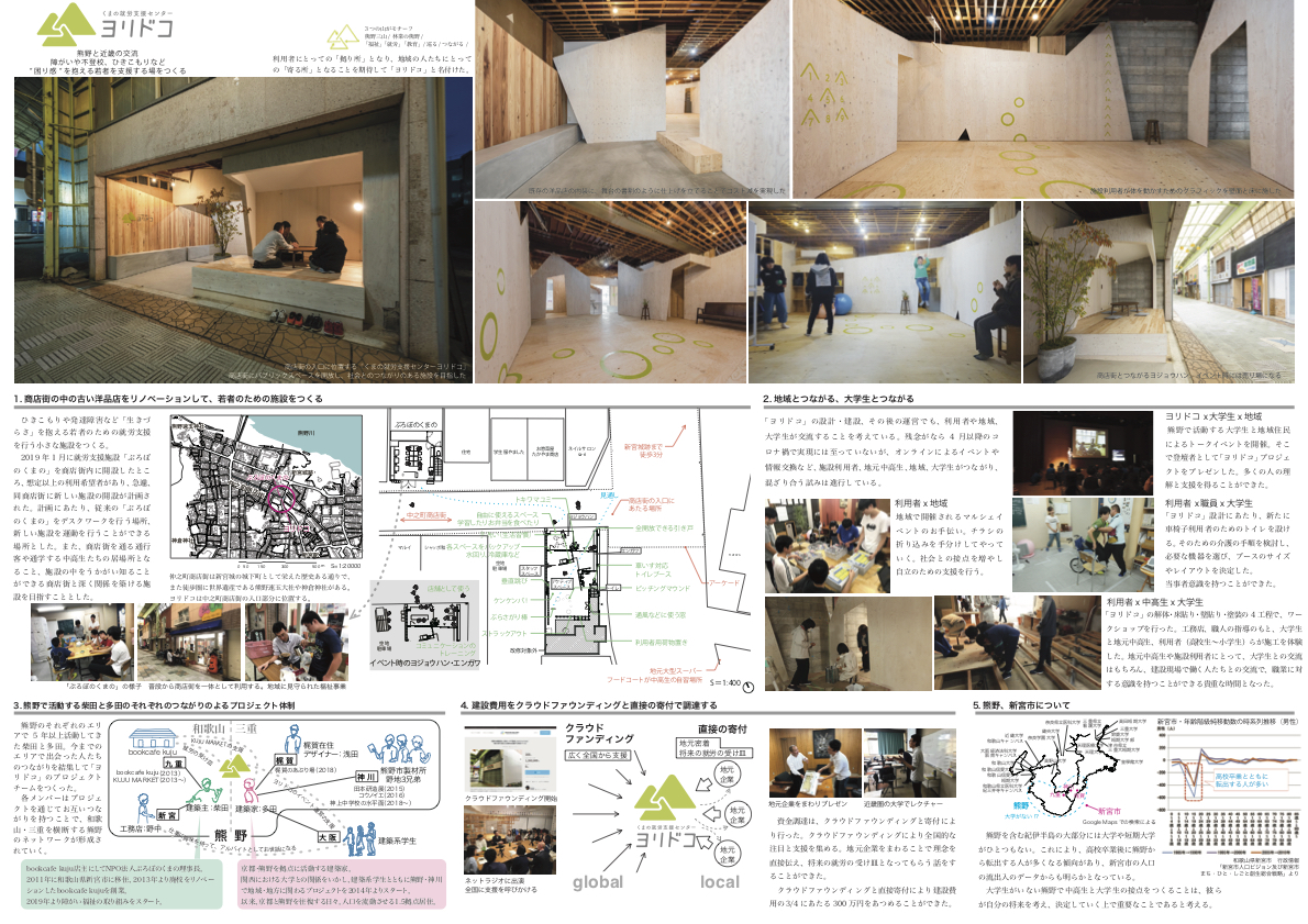 商店街につながる「エンガワ」と開放的な「ヨジョウハン」、その奥に軽く身体を動かすための場所を持つ就労支援施設である。「エンガワ」「ヨジョウハン」は通りゆく人が立ち寄れる場所であり、イベントや店舗として使うことができる。敬遠されがちな施設がまちに受け入れられ、資金の地元企業からの寄付と就労という交換、熊野のエリアで継続的に活動を続ける建築主・建築家と工務店のネットワークなど、いくつもの連携が重なっている。その活動自体がこれから商店街の空間に現れてくることが楽しみなプロジェクトである。