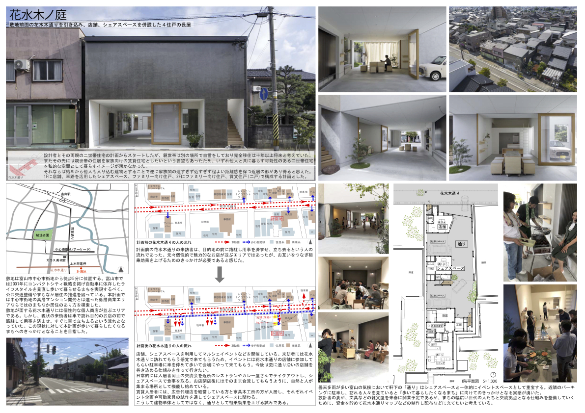 富山市中心部のやや寂しい商店街が舞台である。よく見てみると、いくつかの個性的なお店が頑張っている。設計者は、それらのお店どうしが交流できるような拠点として、集合住宅でありながら、「屋根付き広場」として機能する建築をつくりだした。広場に面して店舗、住宅、シェアスペースが配置され、さまざまな関係性をつくることができる。外階段を上れば空に開けたテラスも活用できる。奥に長い敷地の特性を活かして、しっかりとした空間骨格をもつことが評価された。