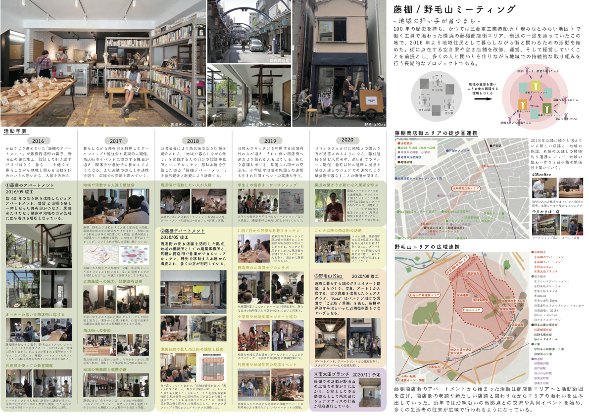 浅草橋周辺の5軒のシェアハウス・ゲストハウスの“住民”が、「自転車で移動できる距離」で街の内外との人達とつながっている。そこにコロナ禍があり、リアルの場に集まることが難しくなった“住民”たちを“関係住民”としてオンラインの場でつなぎなおし、交流を継続、深化させていく試みである。“関係住民”とリアルな街とのつながりが今後発展し、“シェア街”が場所性を獲得していくことが期待される。