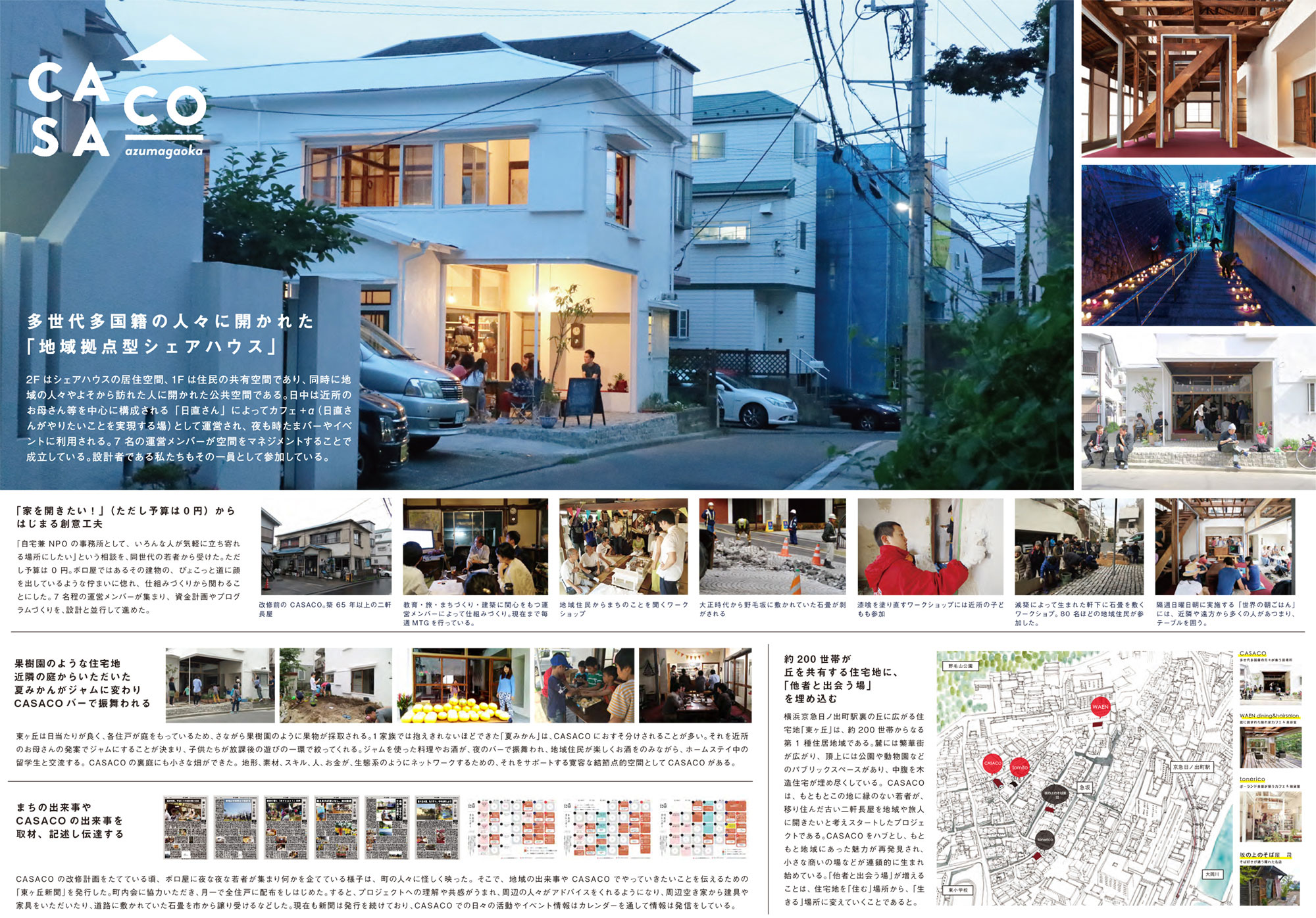 「CASACO」はシェアハウスですが、主として在日外国人向けのシェアハウスです。場所は坂の多い都市である横浜の、典型的な坂の上の住宅地です。単なる専用住宅としてのシェアハウスだけではなく、コミュニティ・ペーパーの発行や、テラスの外に向けた開放、周辺住人との関係作りに非常に積極的です。夜は暗い住宅地も、このテラスによって周辺が明るく照らされます。今後、日本には海外からの労働者が益々増えることになります。
