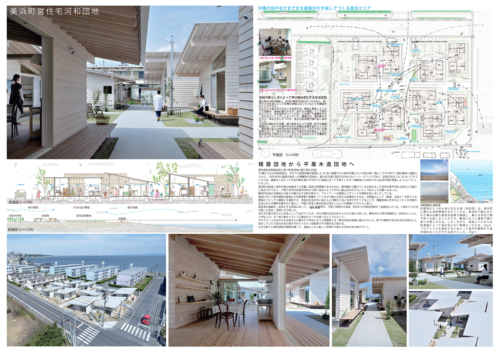 平屋で戸建ての住宅が集合する知多半島・美浜町の町営住宅団地。審査のポイントとされた自治性・経済性・持続性については実現されていないものの、深い軒をもつ住戸群がつくる隣同士との関係、近隣にも開放された美しい空間がつくりだされています。今後の使われ方次第で「Local Republic」が興ることが十分に期待される作品です。