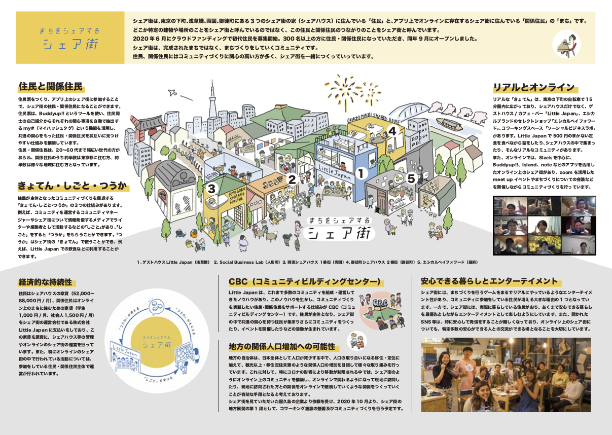 浅草橋周辺の5軒のシェアハウス・ゲストハウスの“住民”が、「自転車で移動できる距離」で街の内外との人達とつながっている。そこにコロナ禍があり、リアルの場に集まることが難しくなった“住民”たちを“関係住民”としてオンラインの場でつなぎなおし、交流を継続、深化させていく試みである。“関係住民”とリアルな街とのつながりが今後発展し、“シェア街”が場所性を獲得していくことが期待される。
